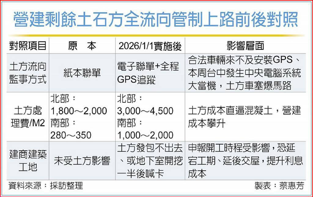 內政部國土管理署自2026年1月1日起正式實施「營建剩餘土石方全流向管制」,原意在強化環境管理,卻因全台缺乏足夠且合法的營建土方與廢棄物棄置場,意外引爆產業鏈危機!「土方清運新制」已在近月造成全台各地土方清運大塞車、價格暴漲、多處工地停工,多家業者焦急喊話,「政府不趕快改進,真的快完蛋了!」