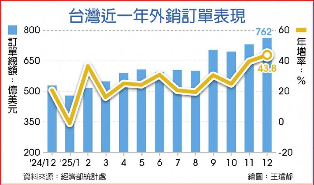 統計處並表示,2025年12月外銷訂單762億美元,創下歷年單月新高,年增43.8%。其中,資訊通信產品單月外銷訂單金額達286.8億美元,創歷年單月新高,年增88.1%,主因為人工智慧應用以及雲端資料服務需求強勁,激勵伺服器、網通產品及顯示卡等接單動能。