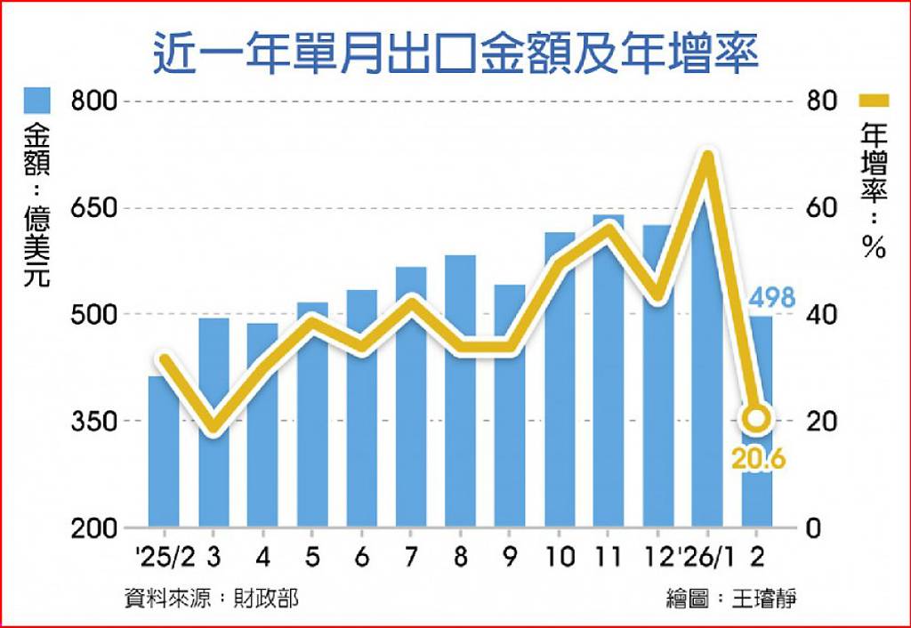AI需求帶動國內供應鏈雨露均霑,出口表現春暖花開,財政部9日公布2月出口值498億美元,創史上同期新高,不但寫下連28紅的佳績,更樂觀預估後續每月出口值600億美元以上,將成為「新常態」。