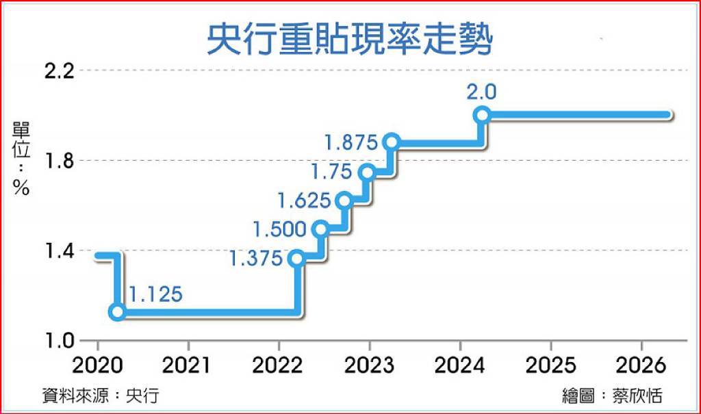 不過,若通膨氣焰明顯高漲,央行也可能進一步揮動利率政策大刀,回顧央行前一次升息是在2024年3月,國內面臨油電雙漲壓力,央行在2024年首季理監事會上預防性升息半碼(0.125個百分點),重貼現率從1.875%調升至2%並維持至今,2022年2月俄烏戰爭爆發,聯準會為抑制通膨壓力啟動激進升息,2022年自3月起累積升息17碼,創1980年代以來最速紀錄;我國央行於2022年3月跟進升息1碼,至2023年3月為止累計五度升息,總計升息3碼。