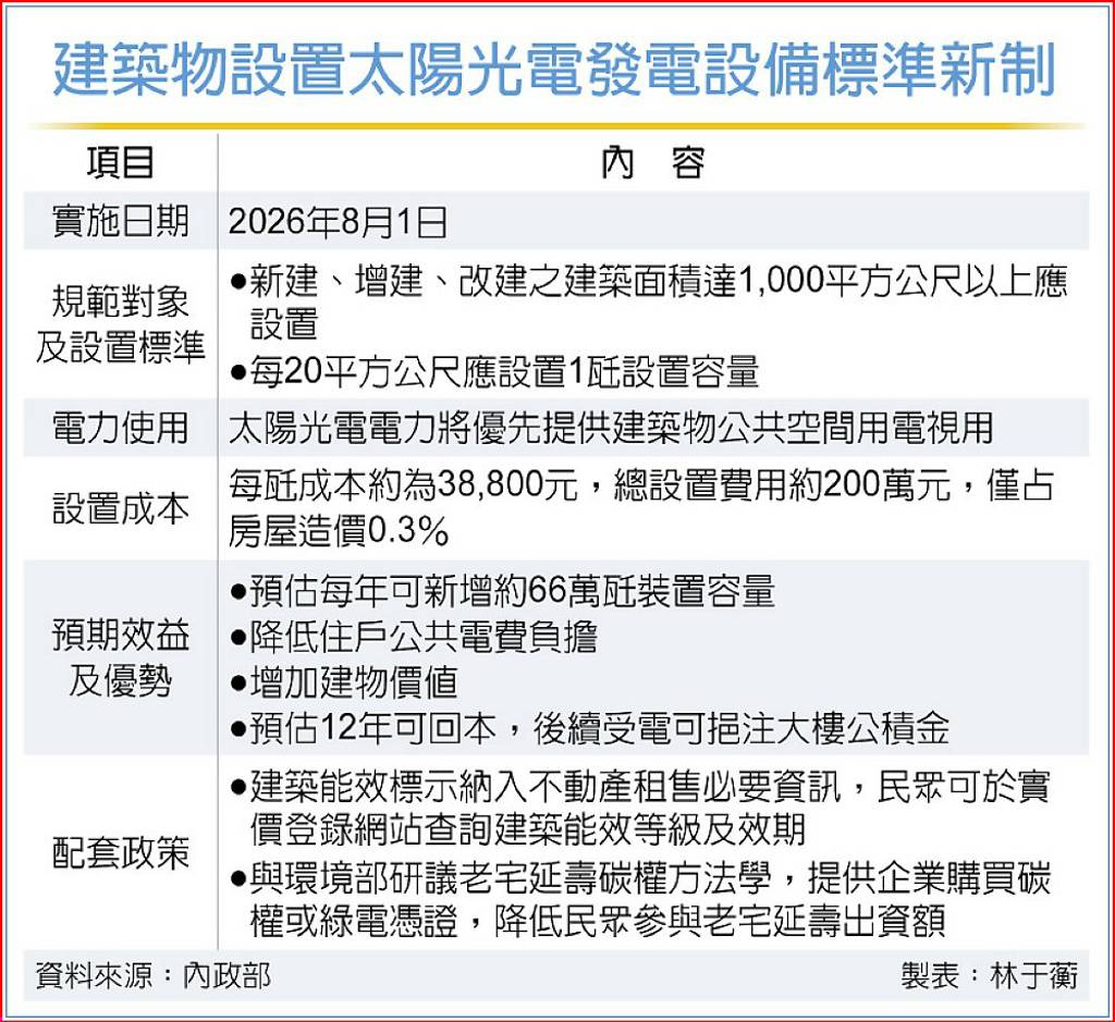 「建築物設置太陽光電發電設備標準」將自今年8月1日起正式實施,針對新建、增建及改建且建築面積達1,000平方公尺以上建築,規定每20平方公尺須設置1瓩太陽光電容量,估年增66萬瓩裝置容量。同時,內政部也正與環境部研擬「老宅延壽碳權方法學」,未來民眾參與老宅延壽的出資額,可透過企業購買其「碳權」或「綠電憑證」來抵減。